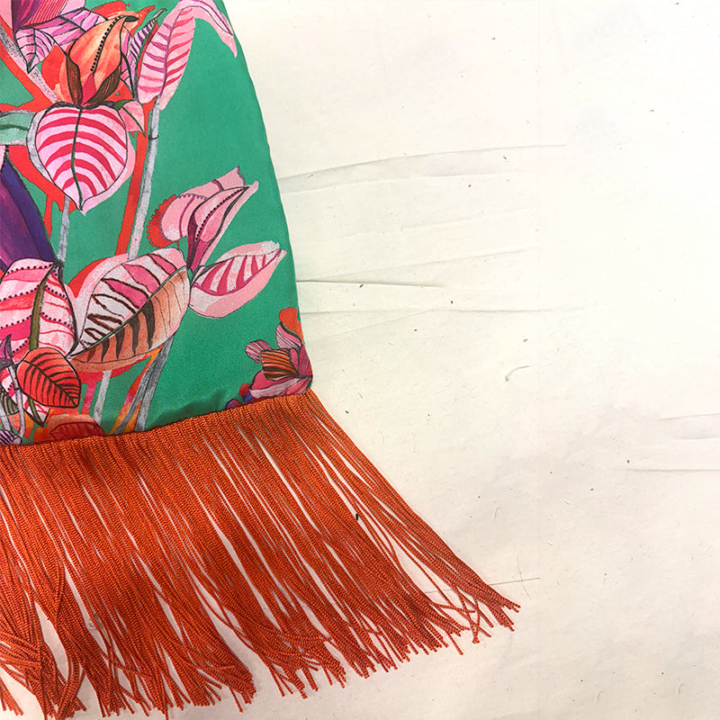 Fire-Toned Fringe: A lush, voluminous fringe in a brilliant Orange hue cascades from the base. This dynamic colour clash with the jade silk is both unexpected and utterly chic, providing beautiful texture and motion.