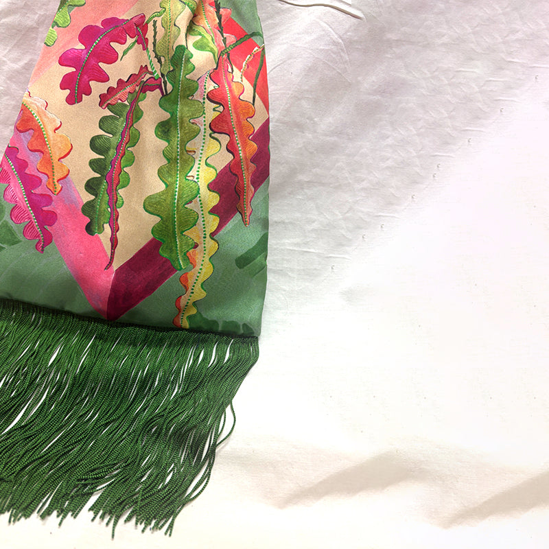 Materials: 100% Silk, 100% Cotton Lining, 100% Acetate Fringe