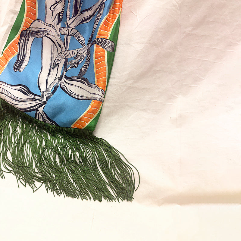 Materials: 100% Silk, 100% Cotton Lining, 100% Acetate Fringe