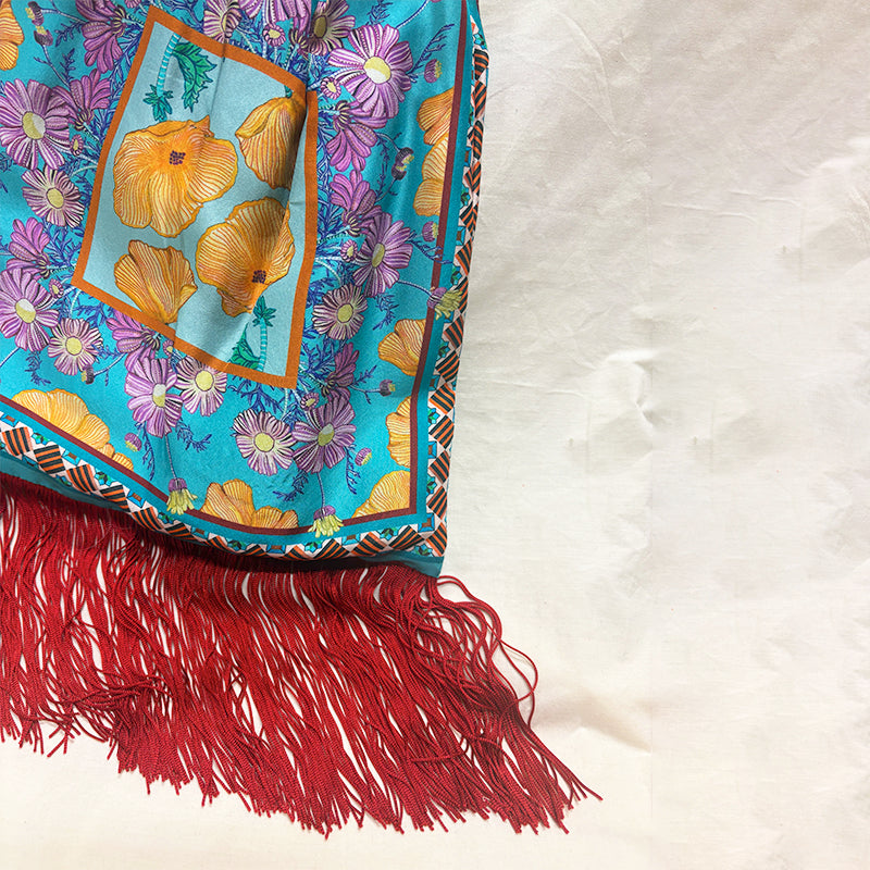 Materials: 100% Silk, 100% Cotton Lining, 100% Acetate Fringe.
